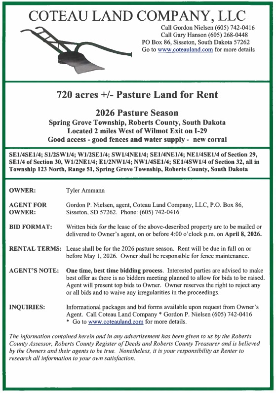 acres of Roberts County Pasture Land for Rent for the 2026