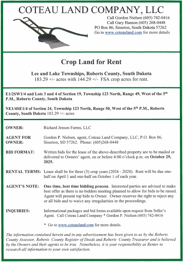 ROBERTS COUNTY CROP LAND FOR RENT
